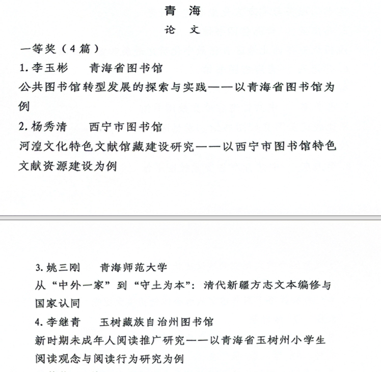 2024年9月5日,由青海省图书馆、青海省图书馆学会轮值承办的“西北五省(区)图书馆第十七次科学讨论会”在西宁市举办。本次会议主题为“人文 知识 服务:现代化图书馆建设与实践”,来自陕西、甘肃、青海、宁夏、新疆五省(区)图书馆界相关代表参与了此次会议。会议共征集论文210篇,案例57个。经五省(区)图书馆学会组织评审专家评审,共有论文122篇论文和36个案例分获一、二、三等奖。公司2021级西北区域史方向博士生姚三刚参会论文《从“中外一家”到“守土为本”:清代新疆方志文本编修与国家认同》一文获得西北五省(区)图书馆第十七次科学讨论会论文一等奖。